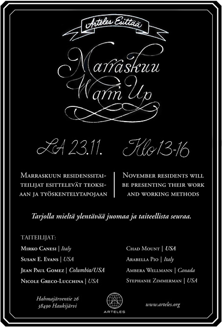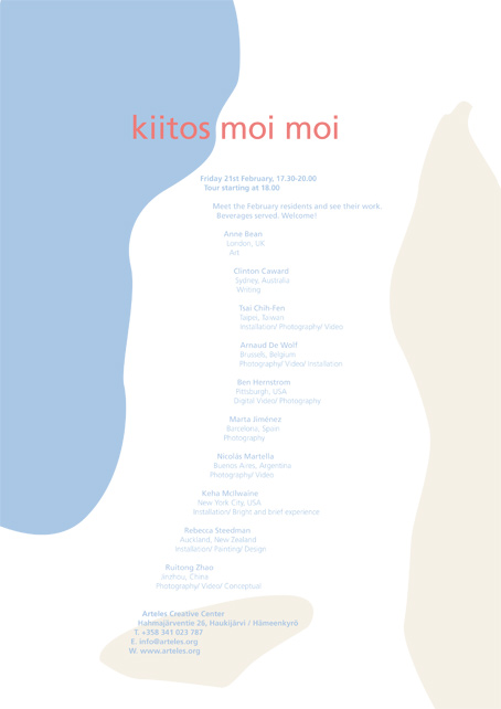 The January residents will open their studio doors to the public on Friday 25th of January. Come visit Arteles for a wide spectrum of artwork and a good chat with the artists!